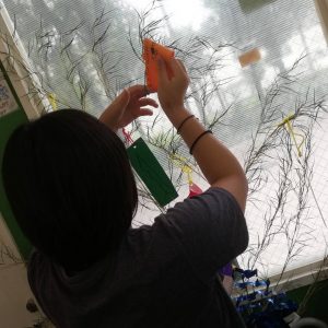 短冊の飾りを手伝ってくれる子もいましたよ♪短冊の飾り付けでは、「どうやってつけるのー?」と言いながら、笹に一生懸命色々は飾りを飾ってくれました♪