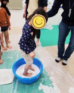 全員遊び終わった後は大きいたらいに片栗粉と水を入れて、混ぜ、水の上を走るという実験をしました?